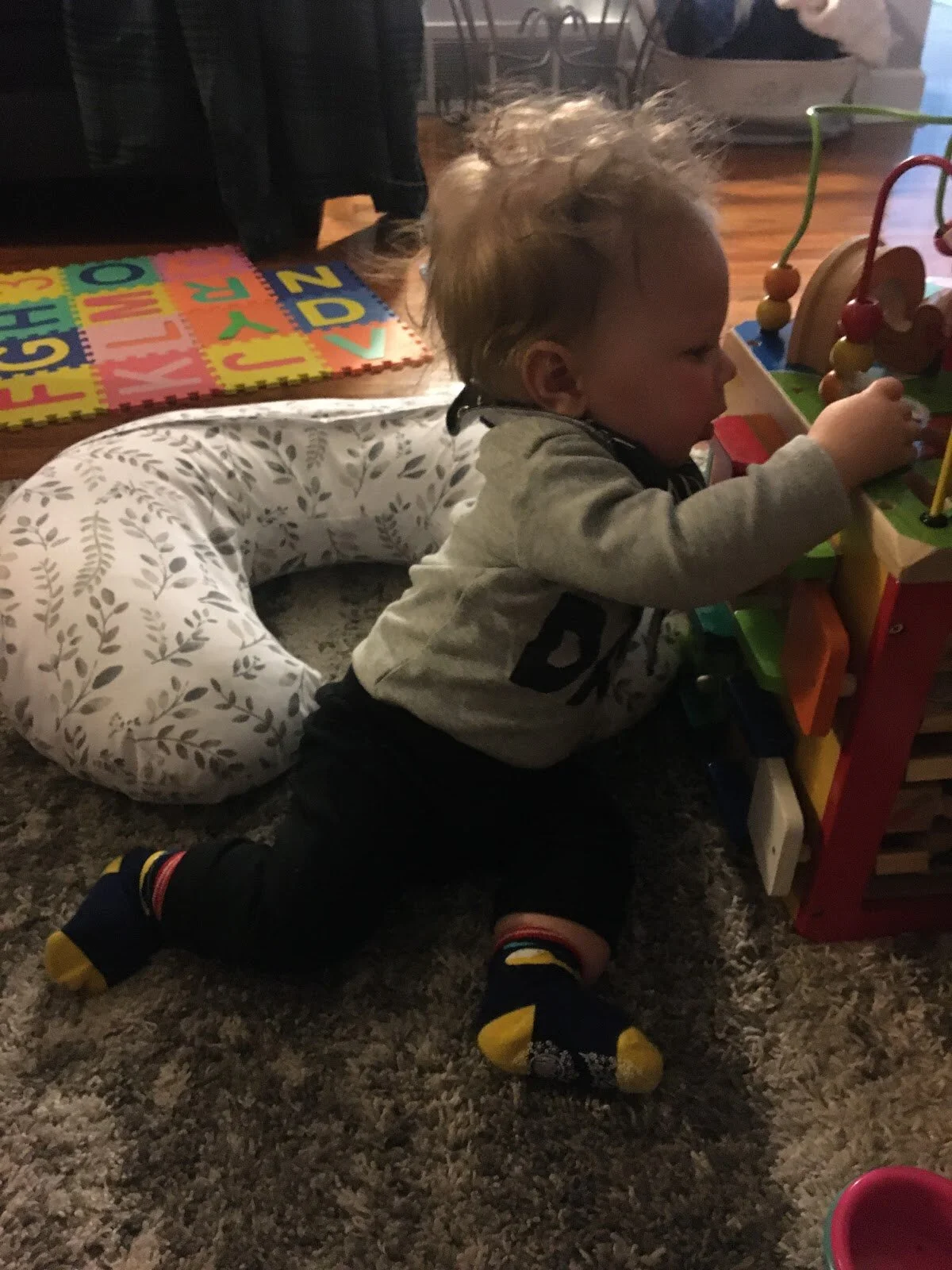 To play in side-sit, it’s best to have a stationary toy near shoulder or eye-level. If the position is challenging, you will notice your baby leaning forward on their hands, unable to sit upright with good posture. Wooden box activity cubes and slanted push-walker toys are great for this. However, you might find placing something fun on your ottoman or couch cushion is the perfect height as well.