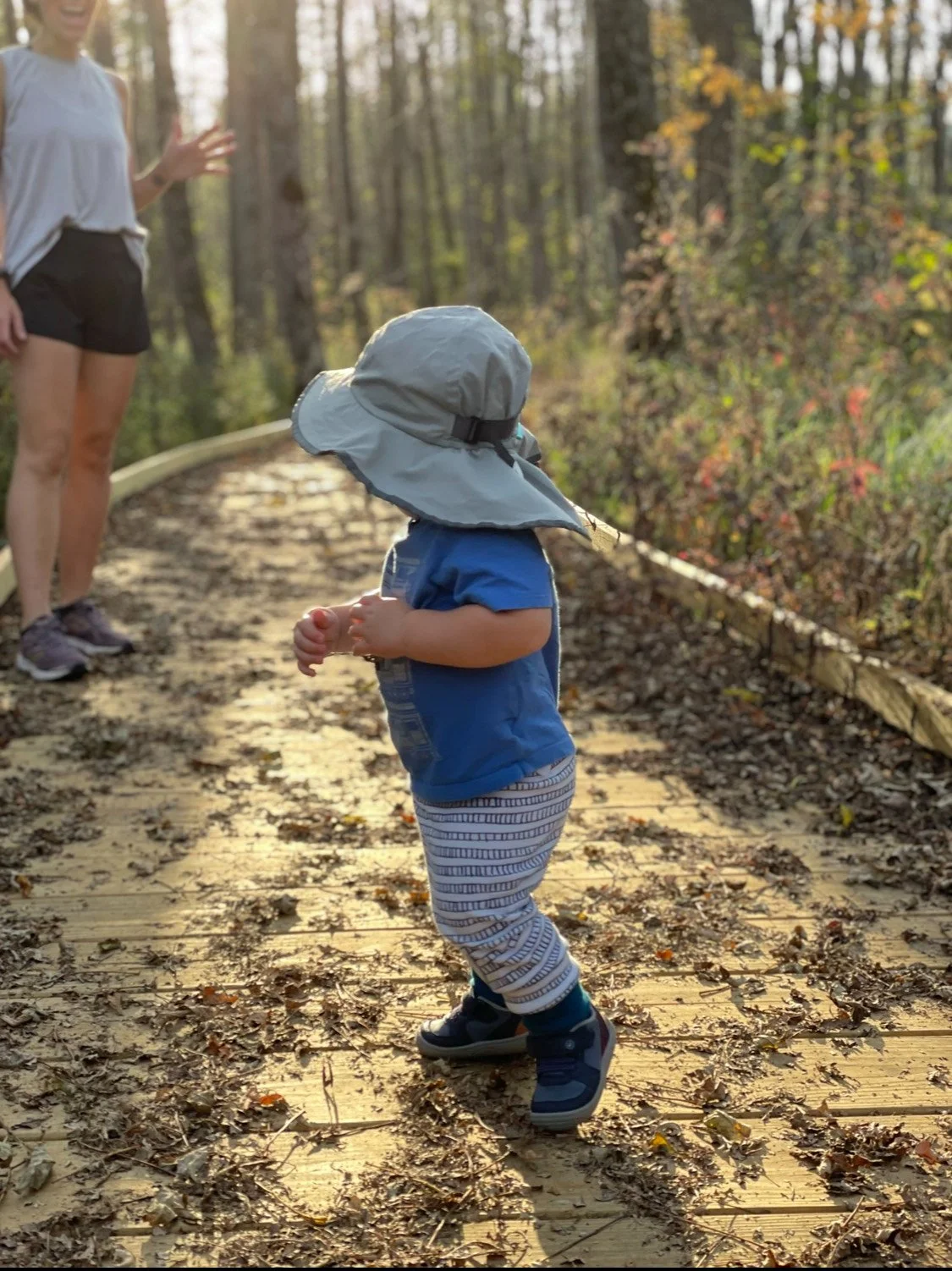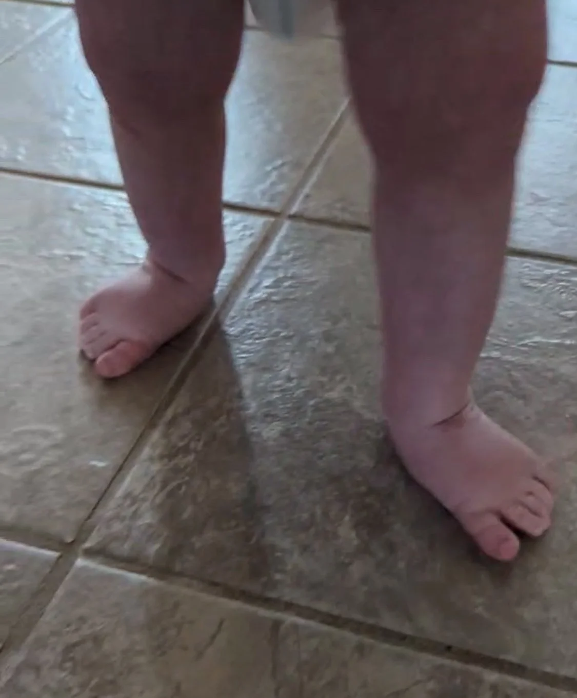 This image shows a toddler with significant flat feet and ankle weakness. This toddler is walking with their feet turned out to gain some stability and balance. He found comfort and stability in SMO braces and Stride Rite Zayn high top shoes.
